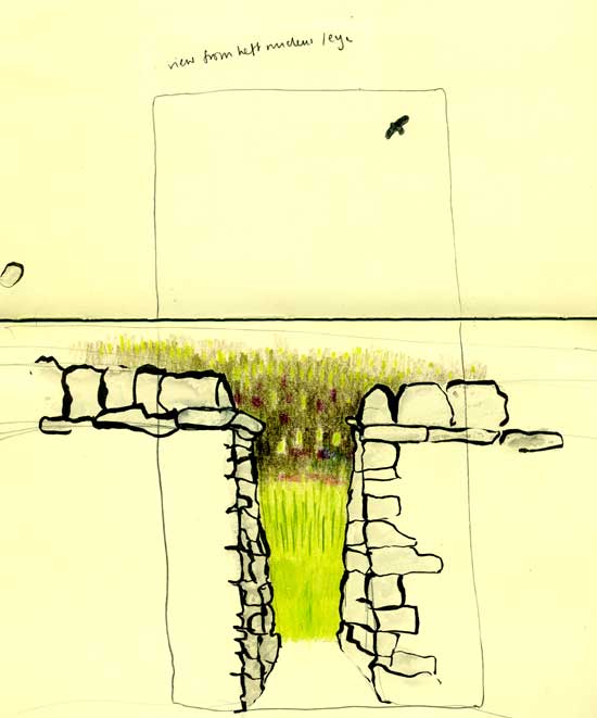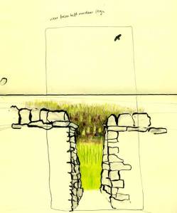 mapping a heft – Cheviot lambs and ewes by a stell. A bridge of railway sleepers over a burn. A track, marked already on an 1867 map. A route used for droving cattle, maybe sheep too. The ewes have spent winter, and summer, here. The stell a nucleus – the eye of their map?