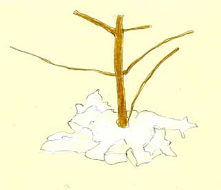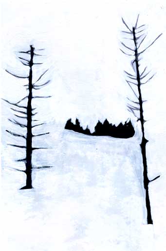 Snags in snow, clear-felled forest: a photograph painted over to allow a focus on deadwood, and its generative possibilities.