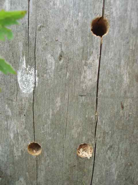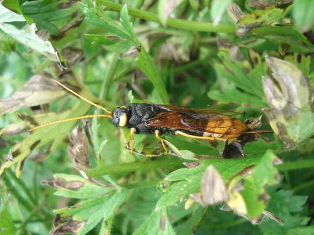 From last summer, photographs of an emerging woodwasp. A sawfly, who can wait till the moment is right. Who prefers live or green spruce.