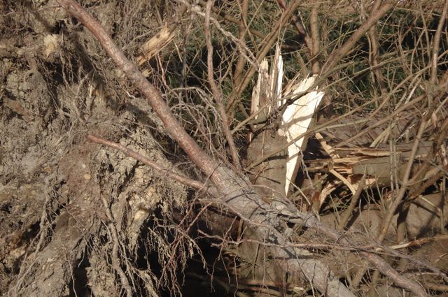 It is hard to make sense of it: roots in the air, some trunks snapped and still vertical, others lying horizontal. Many, many hectares of damage.