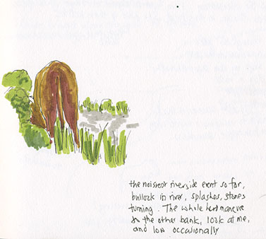Now close to the burn, a skin-slap against a horsefly, the dog slumping in the river. I stop in tree-shade and listen to water flowing: noticing that a fish-ripple is soundless but that a crow caw has two-beats. I learn that few of the things I look at yield sound, and I see little of what I hear.