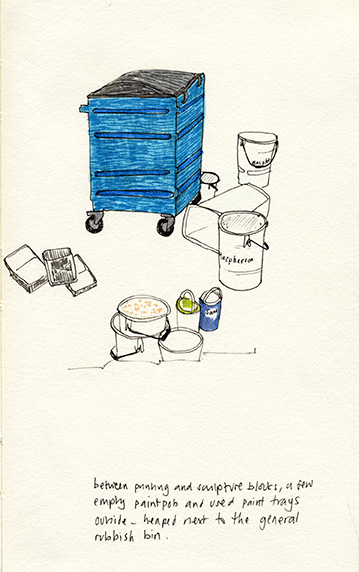 In the school of Fine Art (between the printing and sculpture workshops) some empty paint pots and used paint trays are heaped next to a rubbish bin.