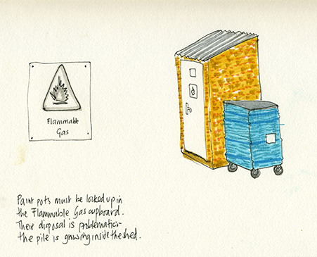 The paint pots lying on the ground must be locked up in the Flammable Gas shelter in the courtyard. Their disposal is problematic, the pile grows inside the shed.