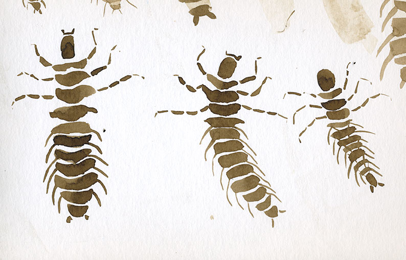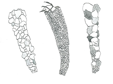 Different species of case-building caddisfly each have their own style of larval case, and these were carefully drawn out.
